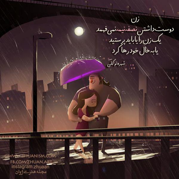 من از نسل لیلی ام... من از جنس شیرینم... من دخترم... با تمام حساسیت های دخترانه ام... با تلنگری بارانی میشوم... با جمله ای رام میشوم... با کلمه ای عاشق میشوم... با فریادی میشکنم... با پشت کردنی ویران میشوم... ب راحتی وابسته میشوم... با پیروزی به اوج میرسم... هنوز هم با عروسکهایم حرف میزنم... هنوزم هم برایشان لالایی میخوانم... هنوزم هم با مدادرنگی خانه رویاهایم را به تصویر میکشم... من دخترم... پر از راز... هرگز مرا نخواهی دانست... هرگز سرچشمه اشکهایم را نمی یابی... هرگز مرا نمیفهمی... مگر از نسلم باشی... مگر از جنسم باشی...
